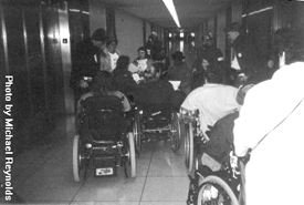 Protracted wrangling, meetings and public debate have not swayed the Roosevelt Memorial Commission. Following the rally at the U.S. Supreme Court, reports Justice For All, 25 disability activists, led by "FDR in a Wheelchair" Campaign Director Jim Dickson and Pat Wright of the Disability Rights Education & Defense Fund, trooped over to the offices of the Commission. Rather than meet with the group, the Commission shut its office, says JFA. The group shoved a message under the Commission's door, calling for "bronze memorial, not a spray painted one, that commemorates FDR in his wheelchair, showing that the country he served as president is proud of him, disability and all." In a fortuitous chance meeting in the hall with Commission co-chair Sen. Daniel Inouye (D.- HI) -- recorded for posterity by activist and photographer Michael Reynolds (below) -- the group called a statue of FDR in a wheelchair "essential."