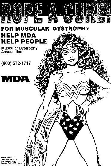 Ad from the back cover of the Oct.-/Nov./Dec. 1997 issue of The Journal of Rehabilitiation, the official publication of the National Rehabilitation Association. The Journal's address is 633 S. Washington St., Alexandria, VA 22314. Fax 703/836-0848 The item is an full page ad. Verbal description of ad: In large type is the headline, "rope a cure for muscular dystrophy!Help MDAhelp people! The image is ofa scantily-clad wonder woman with a lasso in her hand. The text reads, "Muscular Dystrophy Association (800) 572-1717. In very small print are the w ords, "Wonder Woman is a trademark of DCcomics. Used with permiussion. copyright 1994 DCcomics. You can send your candidates for "We wish . . ." to Ragged Edge, P.O. Box 145, Louisville, KY 40201